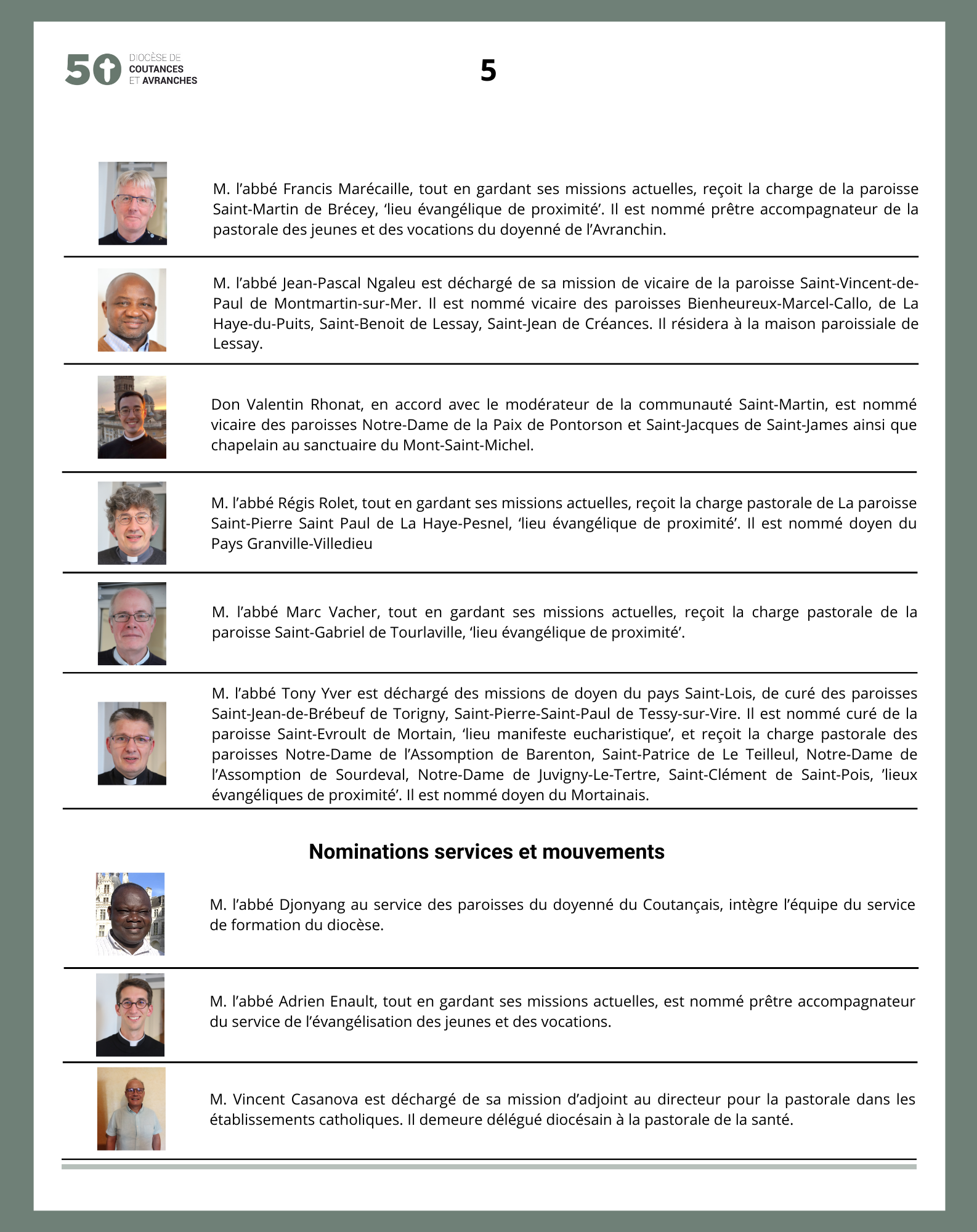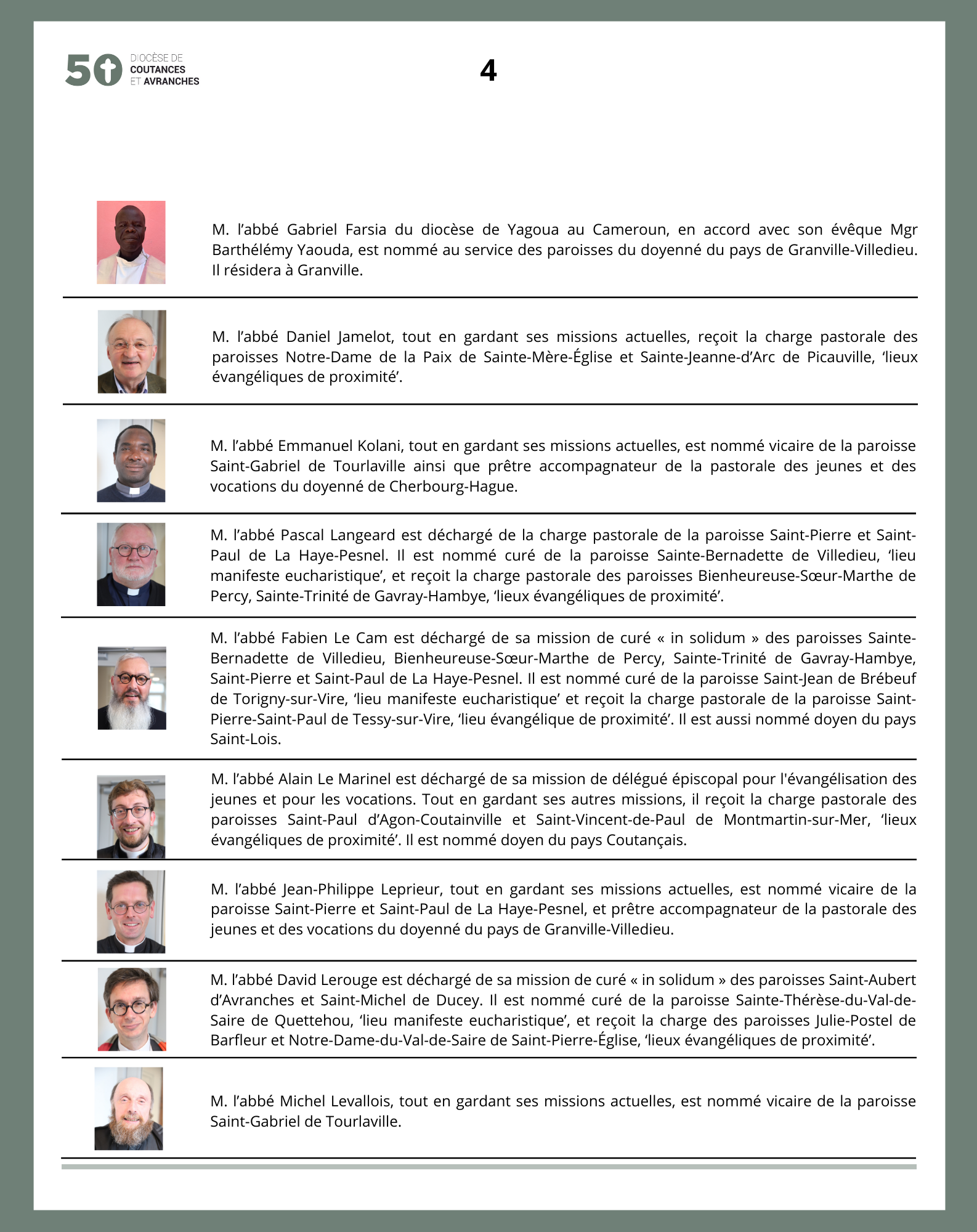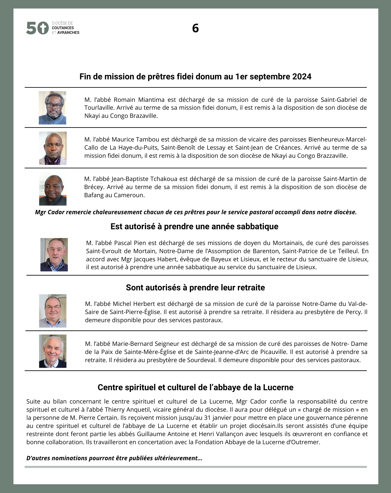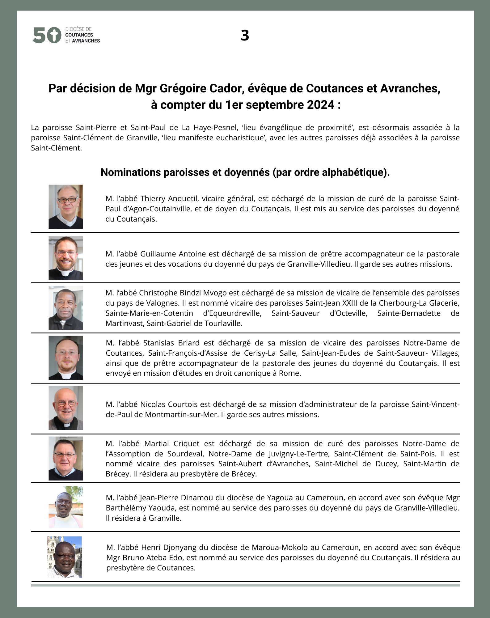 Mgr Grégoire Cador a promulgué ce jour, vendredi 7 juin 2024, de nouvelles nominations effectives à compter du 1er septembre 2024.