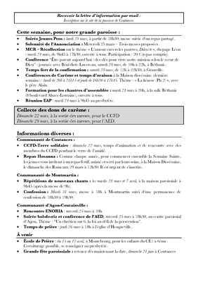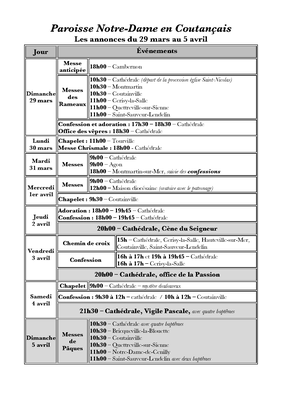 Retrouvez ici les horaires de messes pour la semaine du 29/03 au 25/04 et la feuille d'annonces