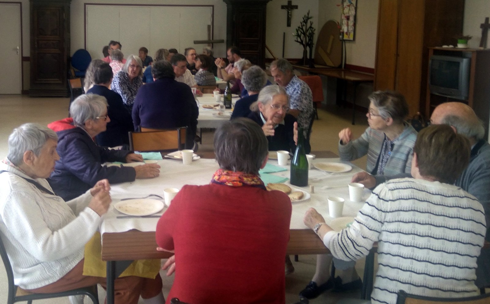 Ensuite, après le partage du verre de l'amitié avec l'assemblée, nous nous sommes retrouvés à la salle Jeanne d'Arc pour un repas convivial et copieux, concocté par les convives.