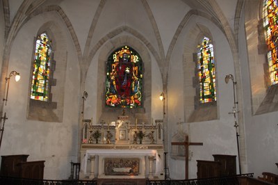 Les vitraux du choeur ont remplacé en 1955 ceux détruits lors des événements de la Libération de 1944. Le vitrail central représente le Christ Glorieux entouré des symboles des quatre évangélistes ; y figurent également, en rappel, l'Alpha et l'Oméga qui se trouvaient déjà gravés, au 15ème siècle, sur le tympan de l'une des ouvertures du clocher.